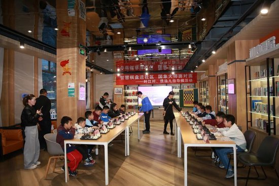 叶江川和侯逸凡两位大师与同学们下指导棋 。